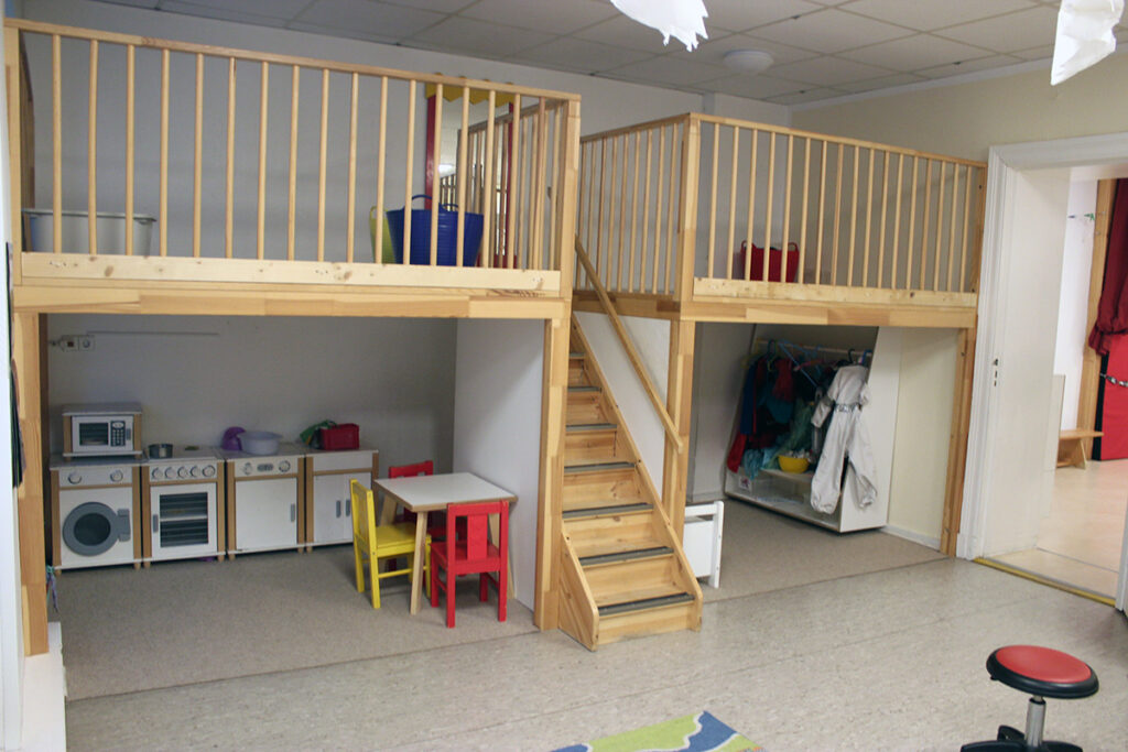 Der Elementarbereich verfügt über vier Funktionsräume, einem Waschraum, einer Garderobe für alle Kinder der Einrichtung, sowie eine Küche.