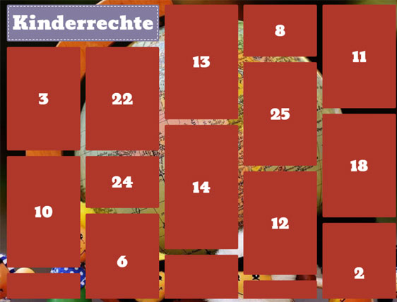 In diesem Jahr haben die Kitas die Möglichkeit, mit einem selbsterstellten, trägerinternen, digitalen Adventskalender zum Thema Kinderrechte, sich gemeinsam mit den Kindern an 24 Tagen den Themen zu widmen. Vielfältige Aktivitäten verstecken sich hinter den einzelnen digitalen Türchen – angefangen von Liedern bis hin zu Bastelaktionen.